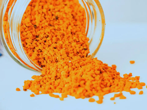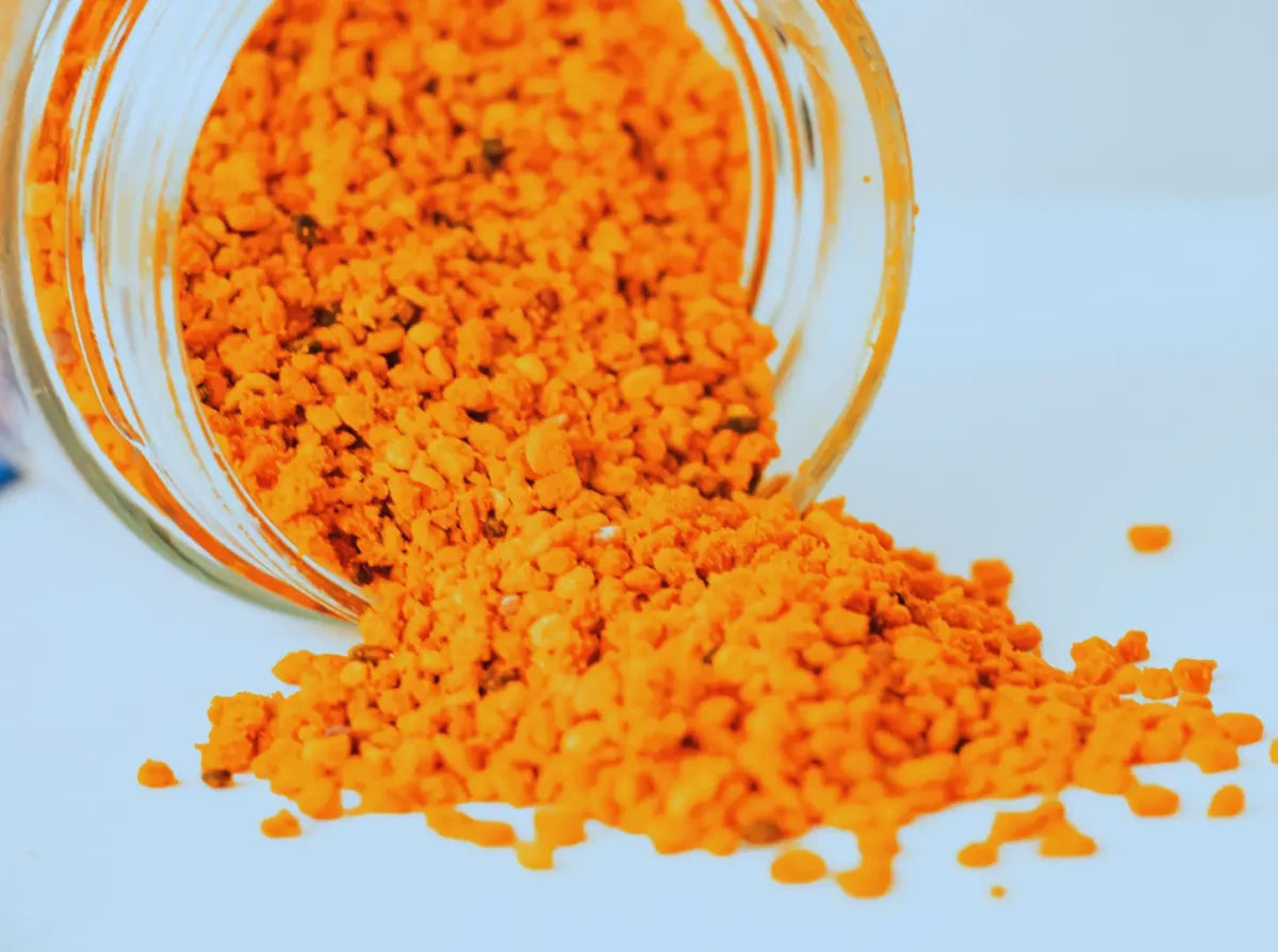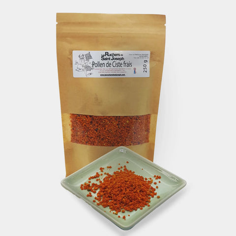 Aspect et texture Ce pollen se distingue par une teinte orangée intense, caractéristique des fleurs de ciste. Ses grains sont tendres et deviennent délicieusement fondants après décongélation, offrant une texture très agréable en bouche.