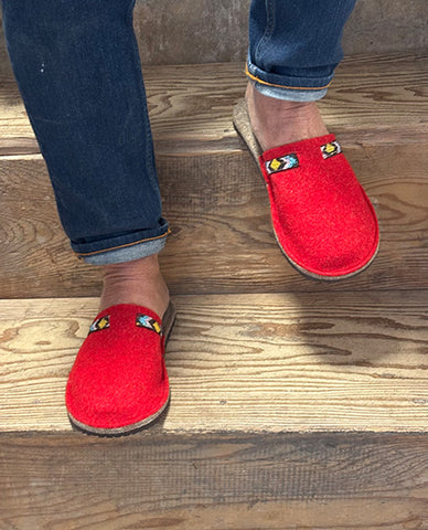 Matières et finitions Le dessus est confectionné dans un feutre de laine rouge éclatant, tandis que la semelle intérieure repose sur un feutre de laine brun épais pour un accueil douillet. Une bride tressée en coton de 15 mm vient souligner le coup de pied, ajoutant une finition fantaisie élégante et un maintien parfait.