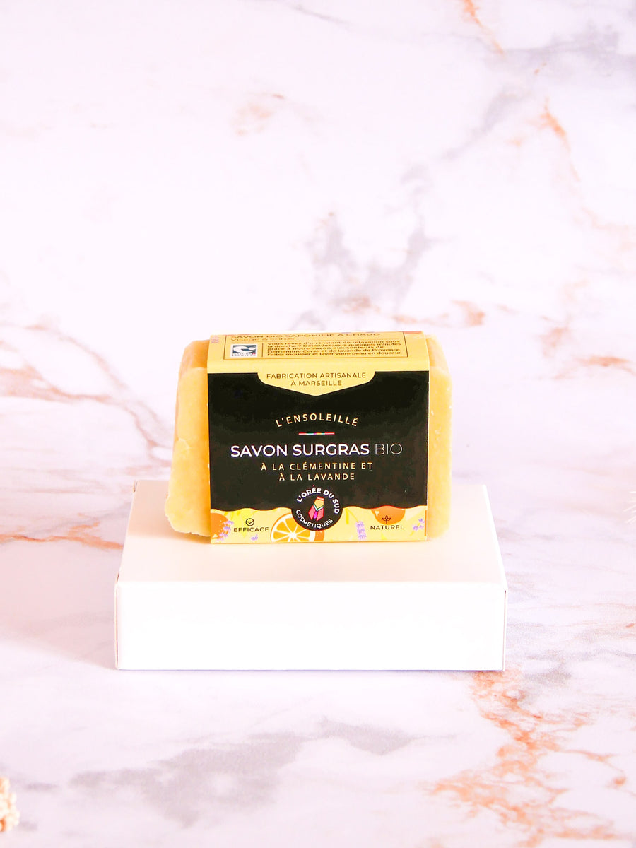 Parfum Céleste : Le savon est délicatement parfumé par des huiles essentielles de Clémentine Corse (pour l'apaisement et la relaxation) et de Lavande de Provence (pour calmer et revitaliser).